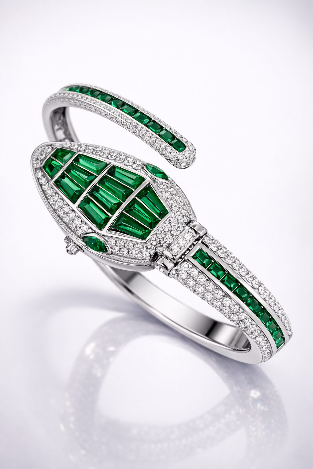 Hand-finished in radiant gold tones, the watch face dazzles with precision-cut baguette crystals, framed by shimmering pavé accents and hypnotic emerald eyes. Designed for women who don’t follow time — they command it.